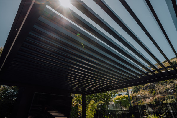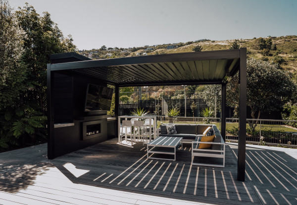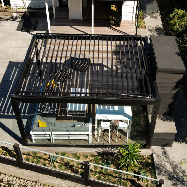 The louvre roof is powder-coated Dulux® Matt Black, and the custom-designed free-standing structure fits perfectly in the available space with the louvre blades set to the optimum sun orientation. The drop-down screen has ensured protection from the elements, including blocking 90% of harmful UV light, and the stunning Glaslide® panels allow flexibility to open and close off the area with stackable, robust glass doors, which move effortlessly on their tracks.